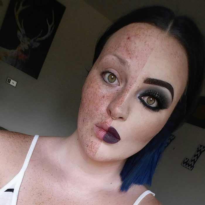 — Web Curiosos (@WebCuriosos) 4 de março de 2017Essa mulher dividiu seu rosto em duas partes, uma aparece como ele é naturalmente, sem a utilização de nenhum tipo de produto. Na outra, ela mostra o resultado da transformação, através das aplicações que realizou. A mudança pode ser vista claramente.